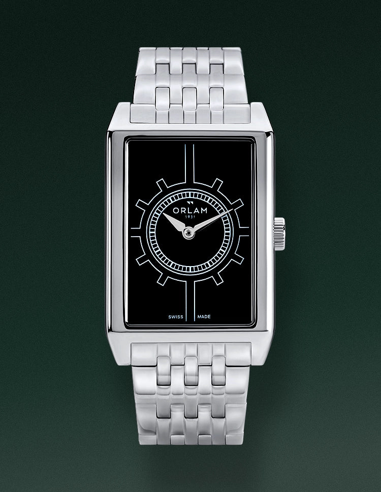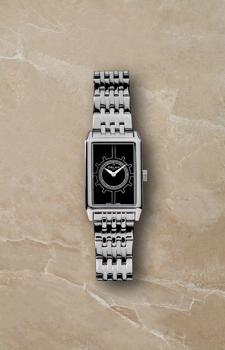 Extra-flat profile rectangular case with a vibrant black dial and steel bracelet combining brushed and polished finishes, made in Switzerland for a heritage silhouette that is elegant and decidedly contemporary.